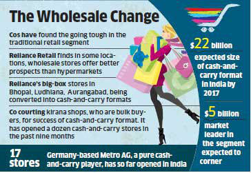 In the cash-and-carry format, companies sell to bulk buyers, such as neighbourhood or kirana stores, who are their members. Reliance is setting up its wholesale stores in places where the concentration of kiranas is high as it is easier to make them customers than competing with them. The business also offers huge potential.